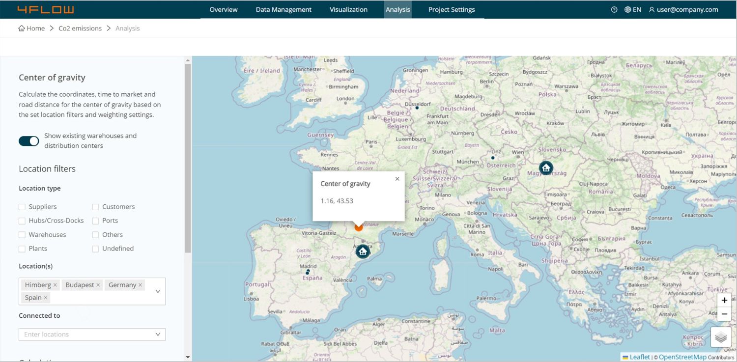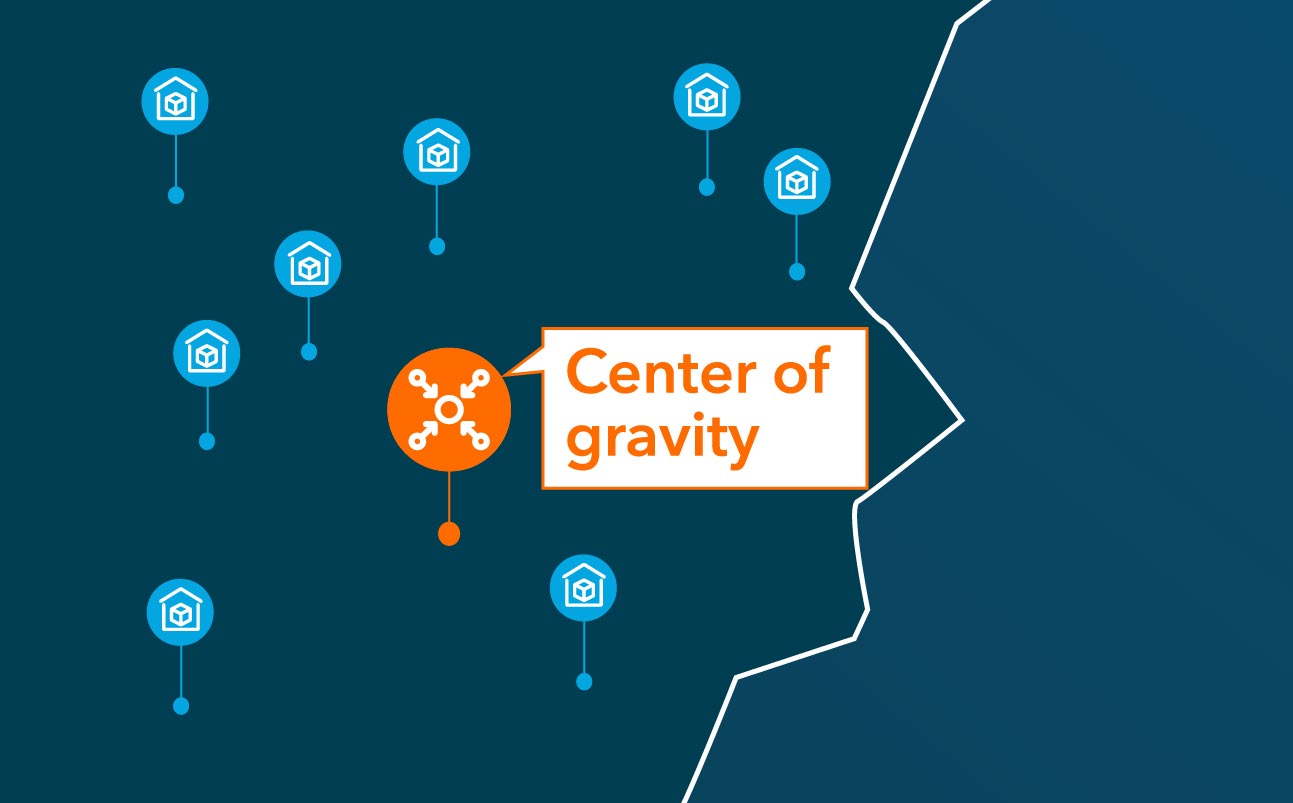 Das Center of Gravity ist der Ort mit den geringsten Gesamttransportkosten oder gewichteten Entfernungen von allen Knotenpunkten (Lager, Versorgungs- und Verteilungspunkte) in einem Supply-Chain-Netzwerk. Die Entfernungen werden gewichtet, um das Volumen oder die Häufigkeit der Transporte zu berücksichtigen.