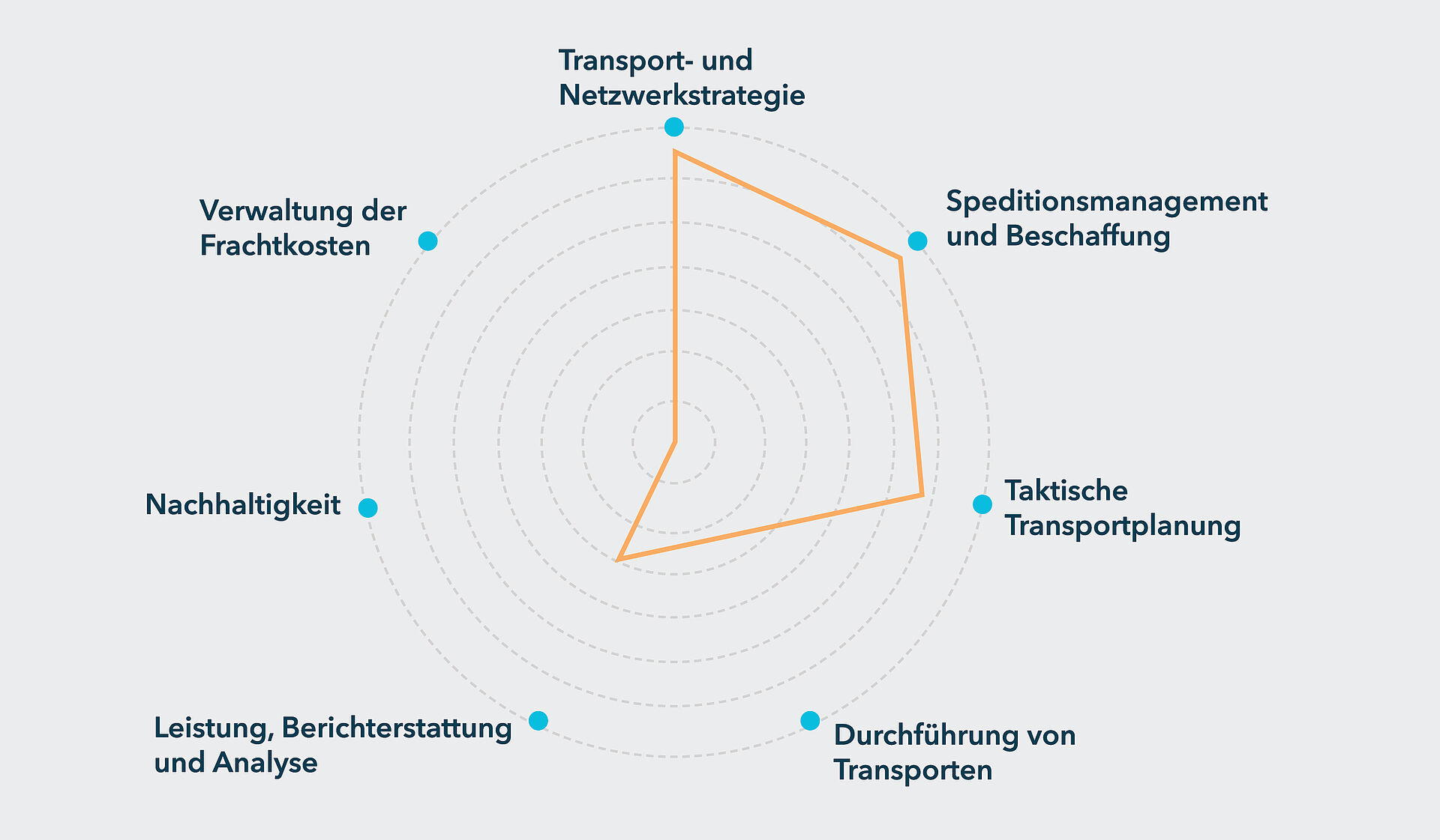 Die Bewertung der Reifegrade im Transportmanagements durch 4flow berücksichtigt insgesamt 79 Prozesse, die in acht Hauptprozessbereiche unterteilt sind: