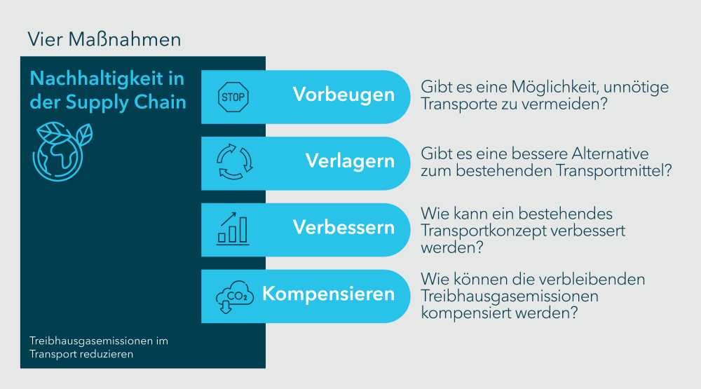 Um die Treibhausgasemissionen in ihren Transportnetzwerken zu reduzieren, können Unternehmen wichtige Maßnahmen ergreifen. In Übereinstimmung mit der GHG Management Hierarchy der IEMA, die sich auf die Vermeidung, Reduzierung, Substitution und Kompensation von CO2-Emissionen konzentriert, empfehlen wir die folgenden vier Maßnahmen: