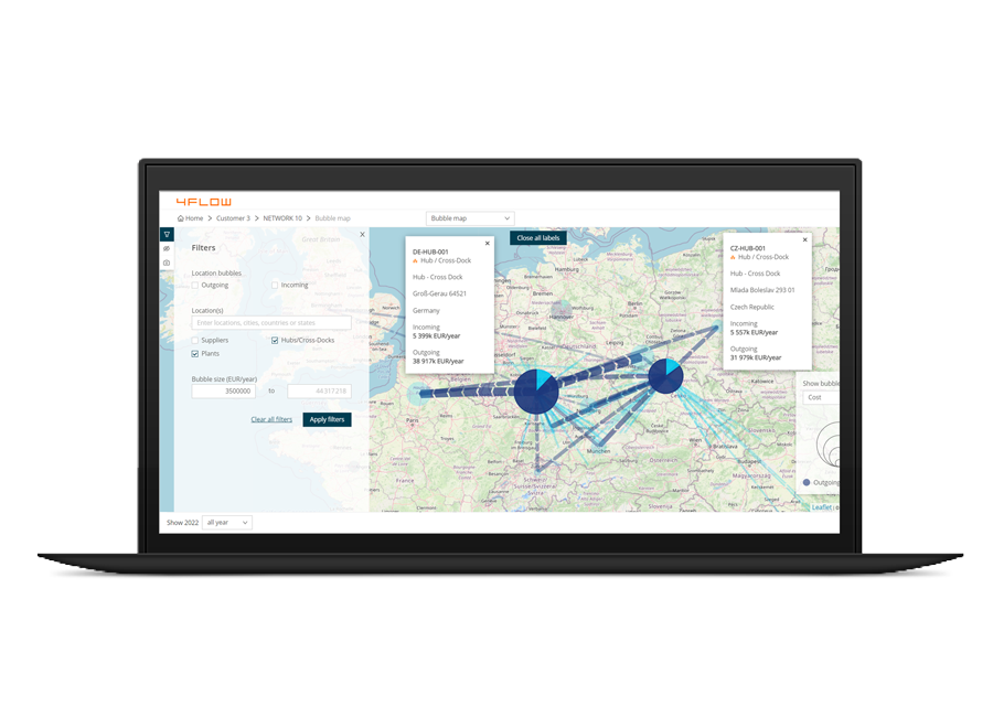 Entscheidende Parameter für die Planung der optimalen Transportstrukturen und -konzepte sind sowohl historische als auch künftige Bedarfe. Die Softwarelösung von 4flow erstellt und vergleicht mögliche Szenarien, und nutzt diese als Grundlage für wichtige Entscheidungen zur Optimierung der Netzwerkstruktur, Reduzierung der Gesamtkosten und langfristigen Planung.