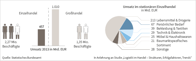 Der Handel ist das Bindeglied zwischen Produktion und Verbrauch. In einem der größten Wirtschaftszweige Deutschlands wurden 2013 rund 1.500 Mrd. Euro umgesetzt und 3,62 Mio. Menschen beschäftigt.